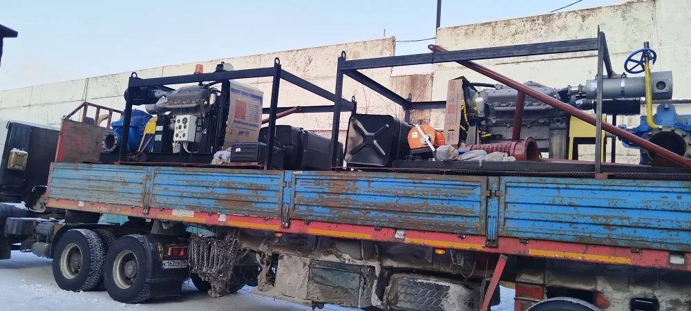 Поворотный всас , фильтром забора ,лебедка грузоподъемностью 3\/6 т. с системой полиспаста, обратный клапан Ду 250, задвижка 30ч6бр Ду 200 Ру 10, станция подкачки , акб 2шт 190а , бак топливный 600л с датчиком уровня топлива и крепежом ,фильтр воздушный и глушитель с креплением комплект , система управления тнвд с фиксацией, уплотнений для фурнитуры и Зип.